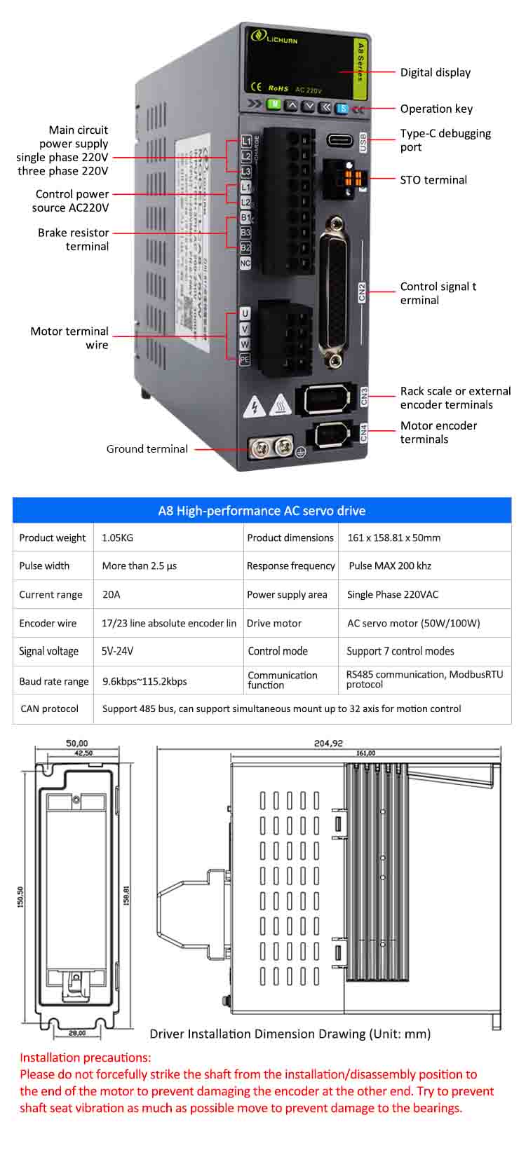 Lichuan AC サーボ モーター ドライバー キット A8 高精度 STO ABZ 50W 0.16N.m 220V 0.8A 3000RPM IP65